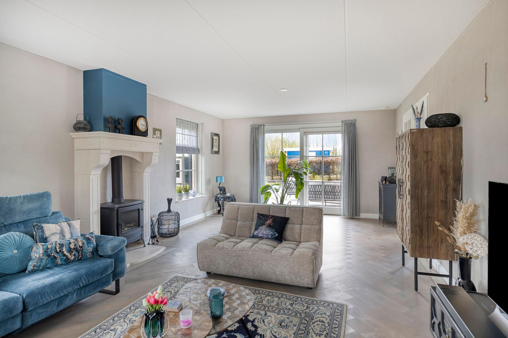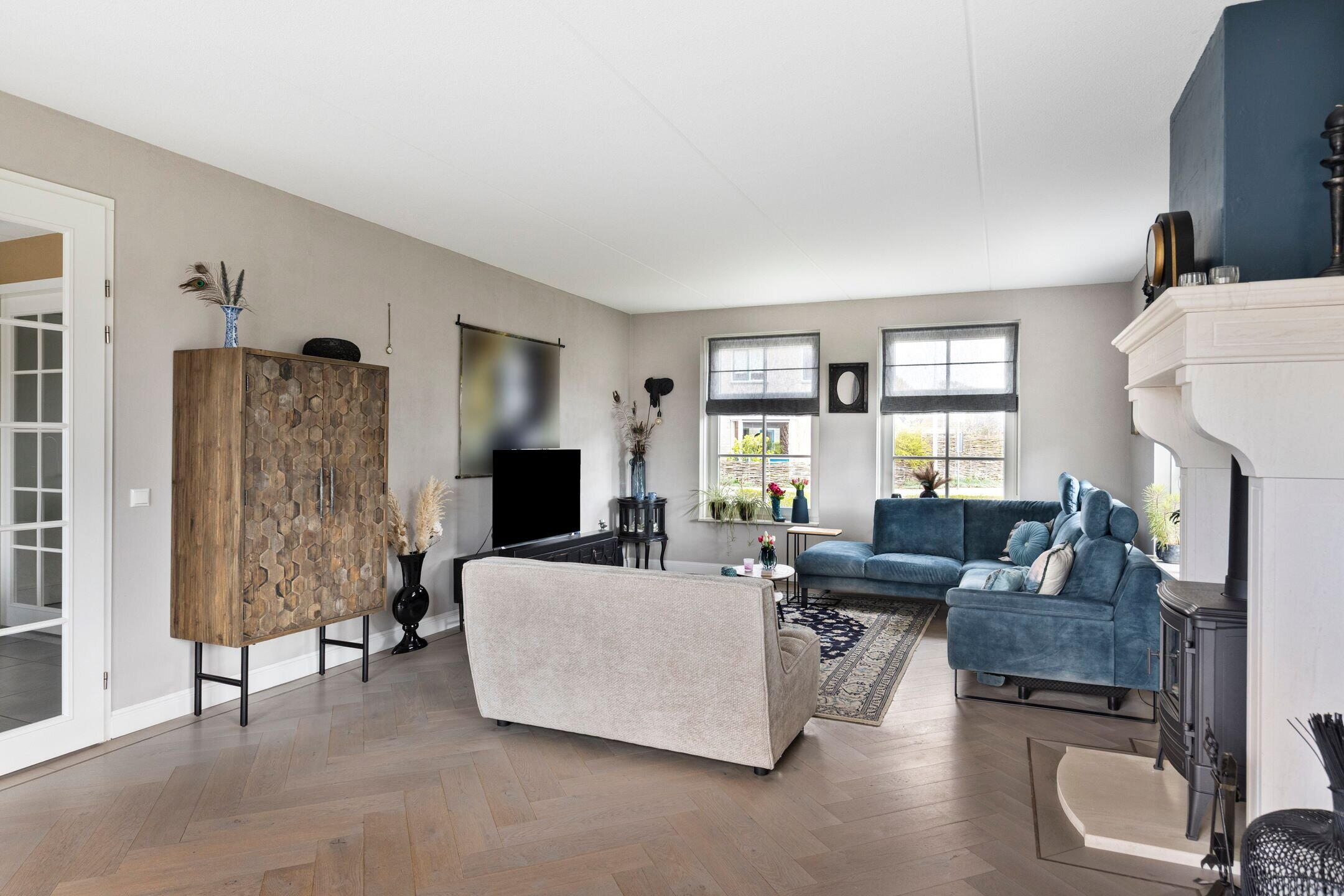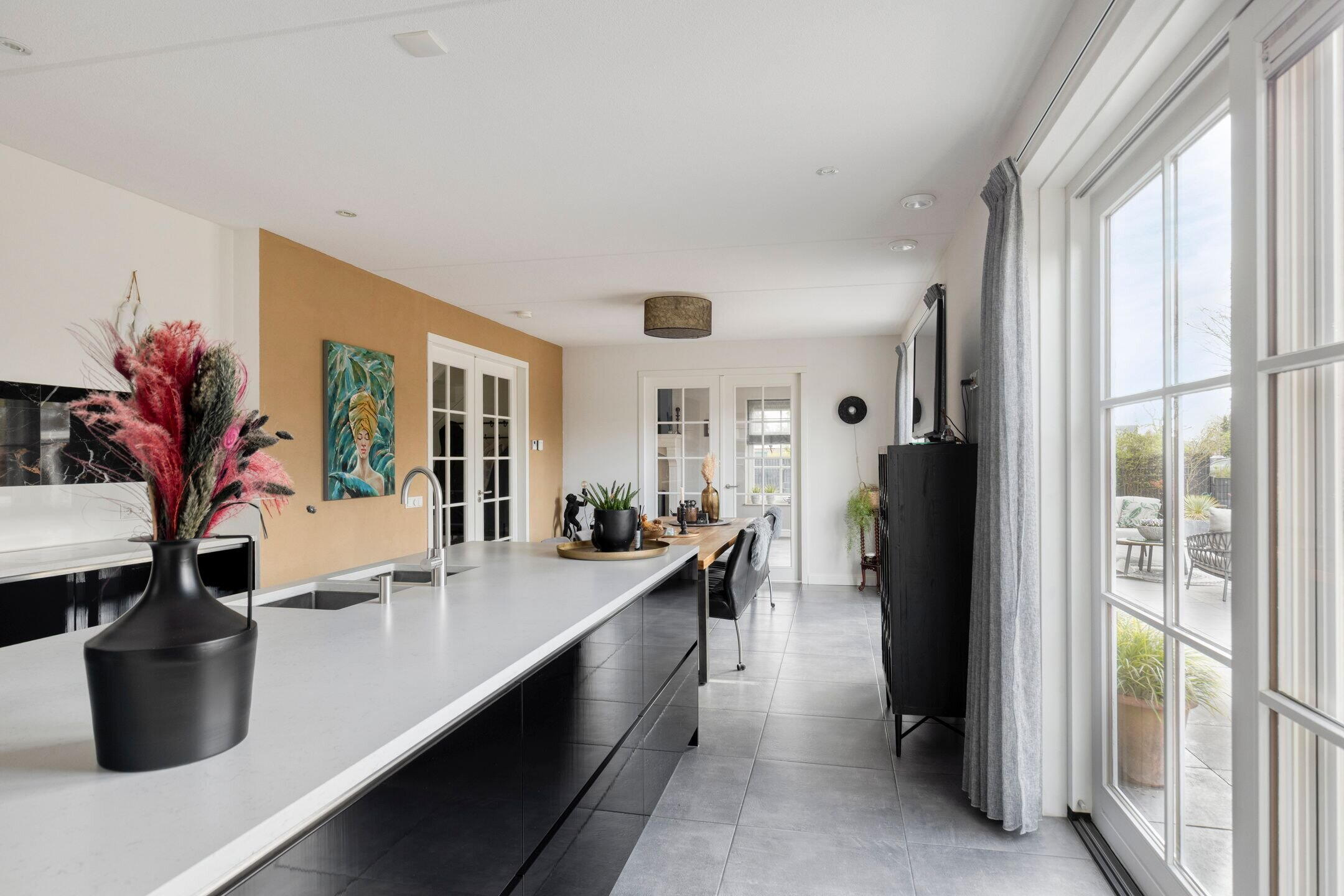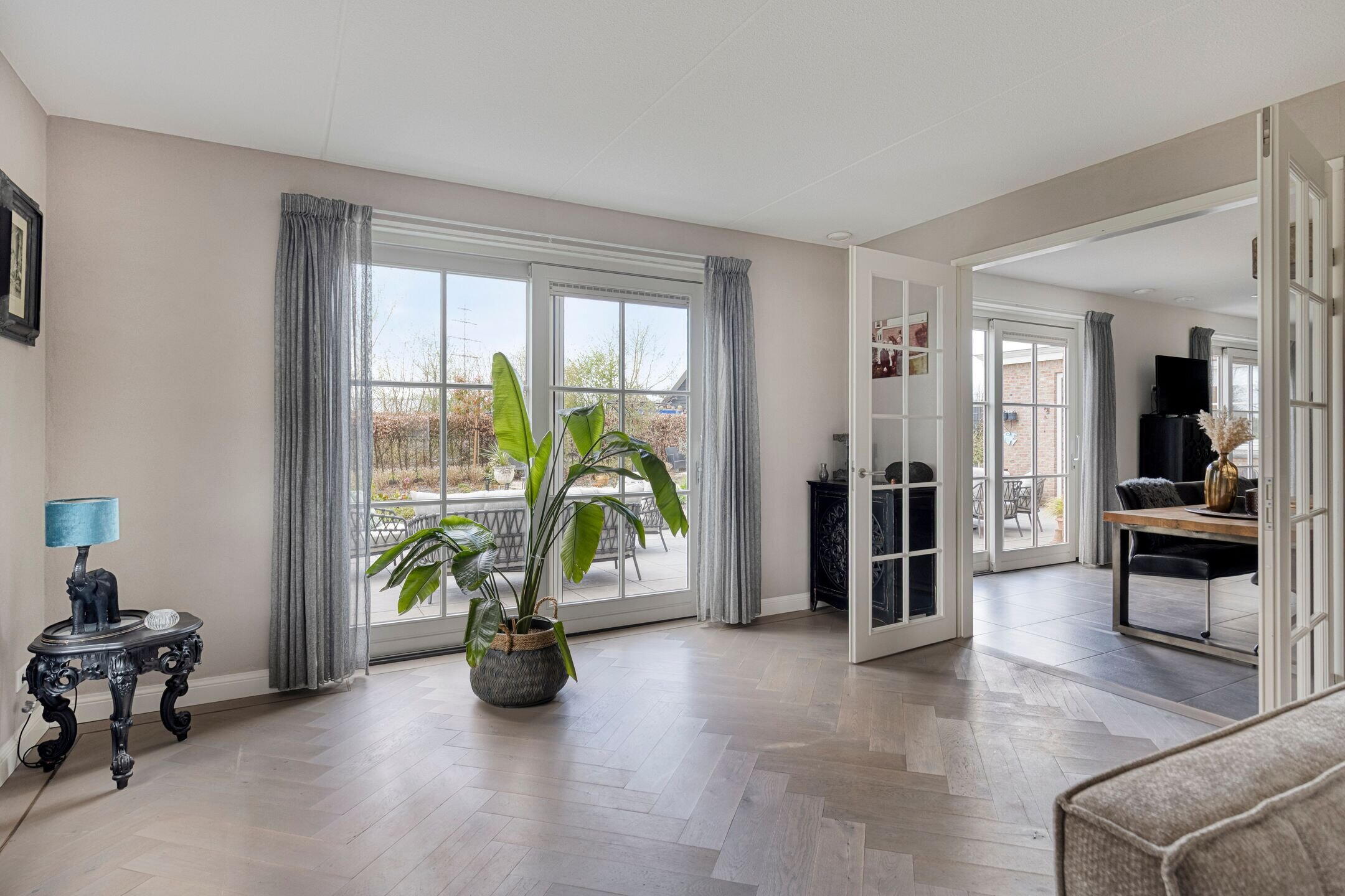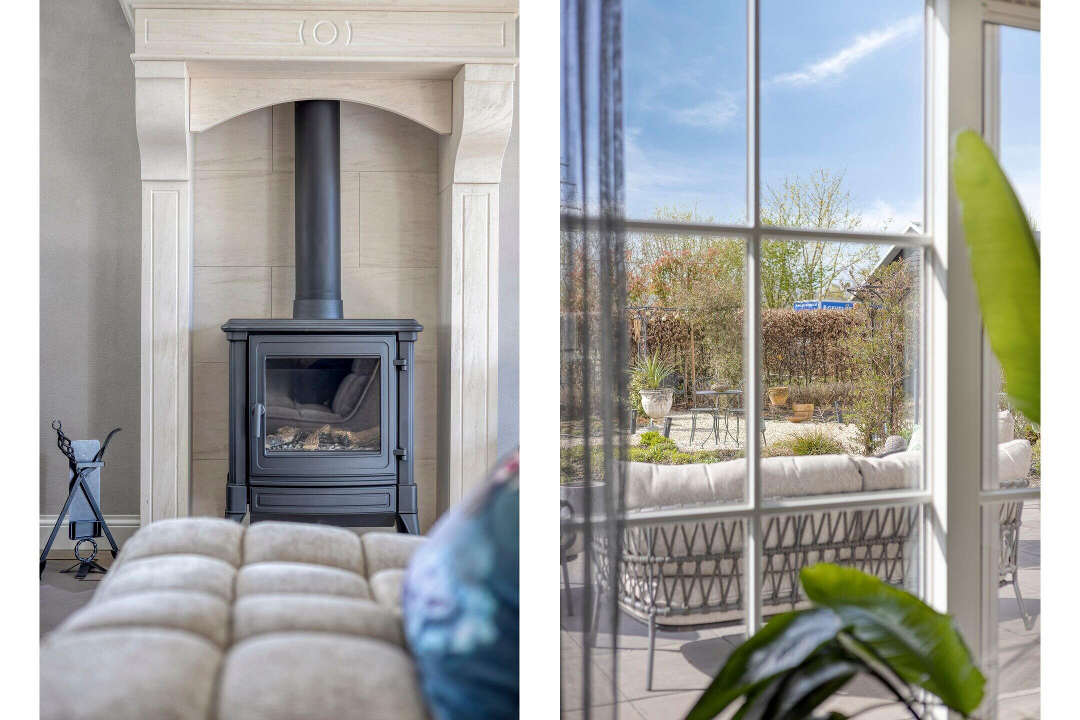 De aangrenzende woonkamer, bereikbaar via stijlvolle openslaande deuren, biedt een sfeervolle leefruimte met haard en eveneens een schuifpui naar buiten. Grote raampartijen zorgen voor een overvloed aan daglicht en versterken het ruimtelijke gevoel.