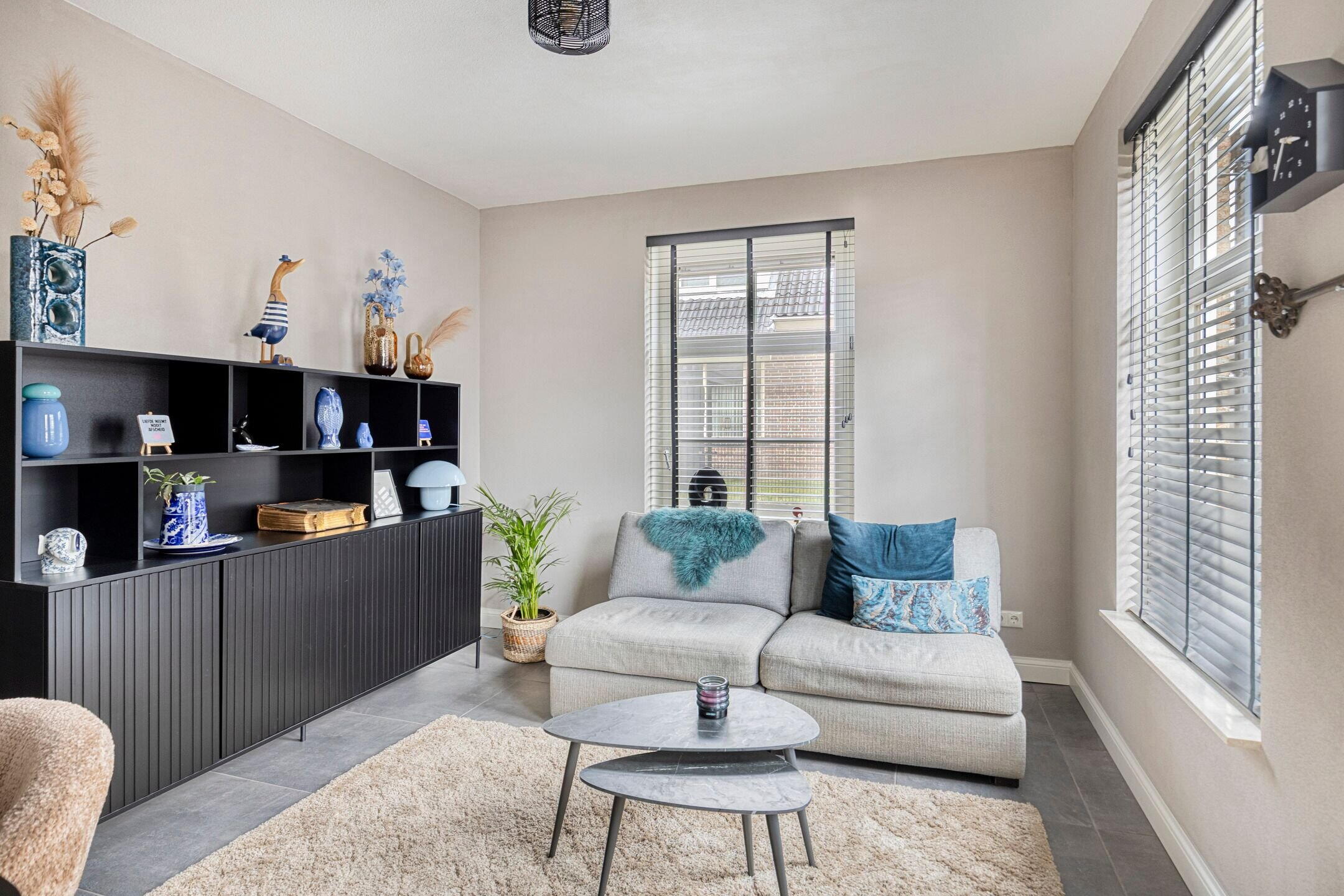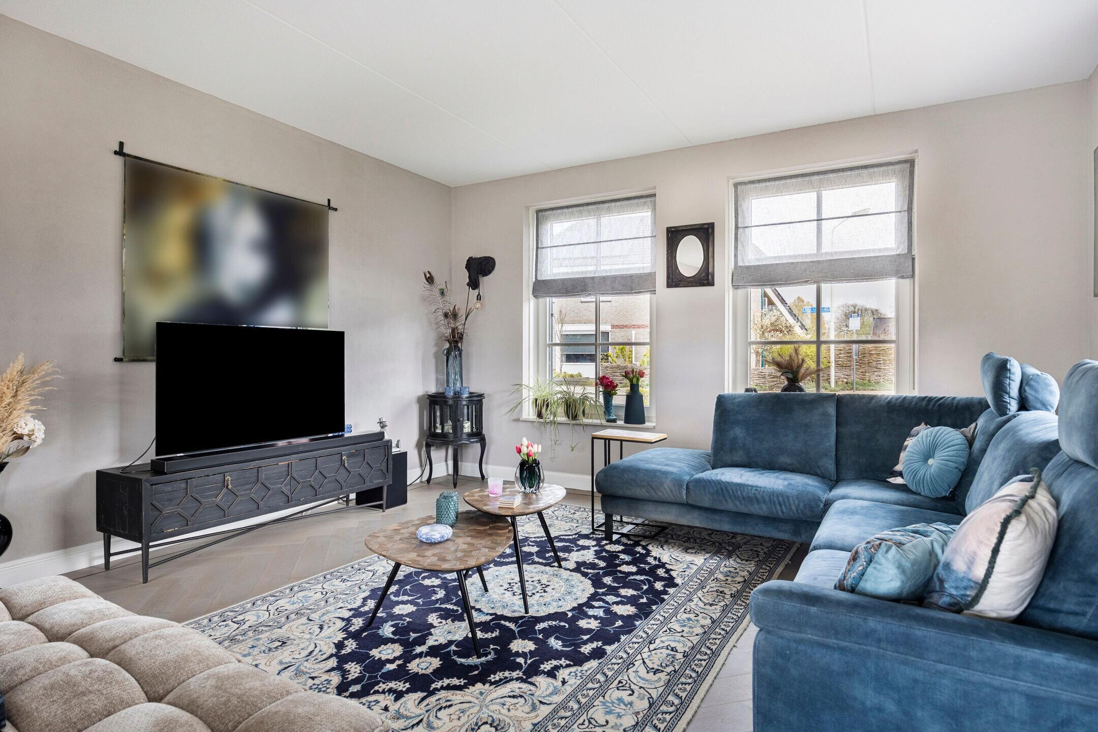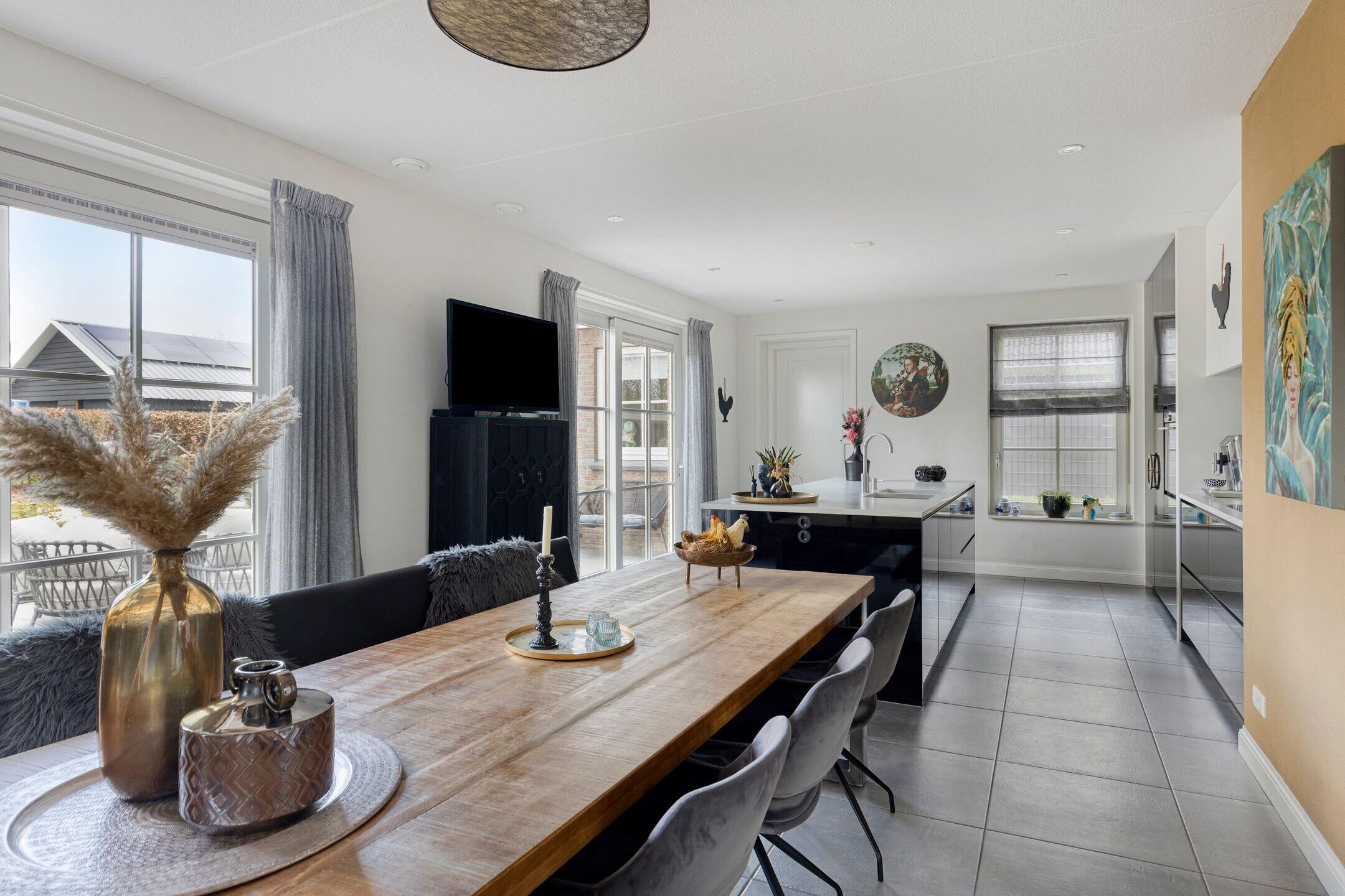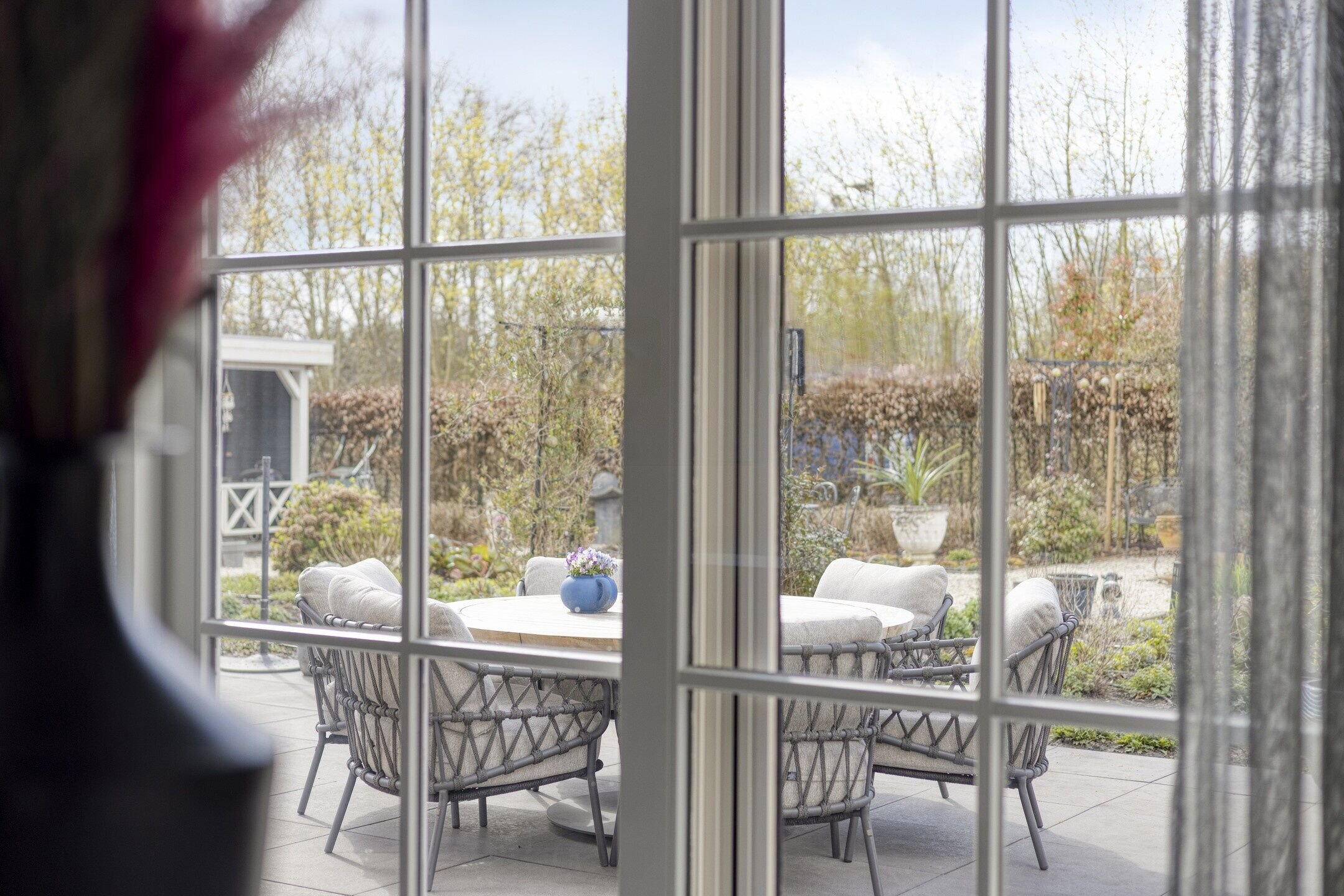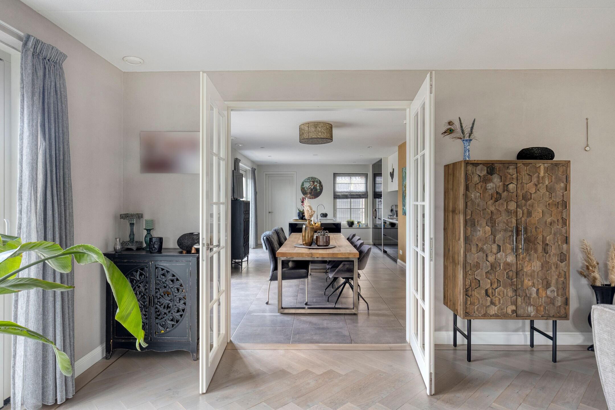 De aangrenzende woonkamer, bereikbaar via stijlvolle openslaande deuren, biedt een sfeervolle leefruimte met haard en eveneens een schuifpui naar buiten. Grote raampartijen zorgen voor een overvloed aan daglicht en versterken het ruimtelijke gevoel.