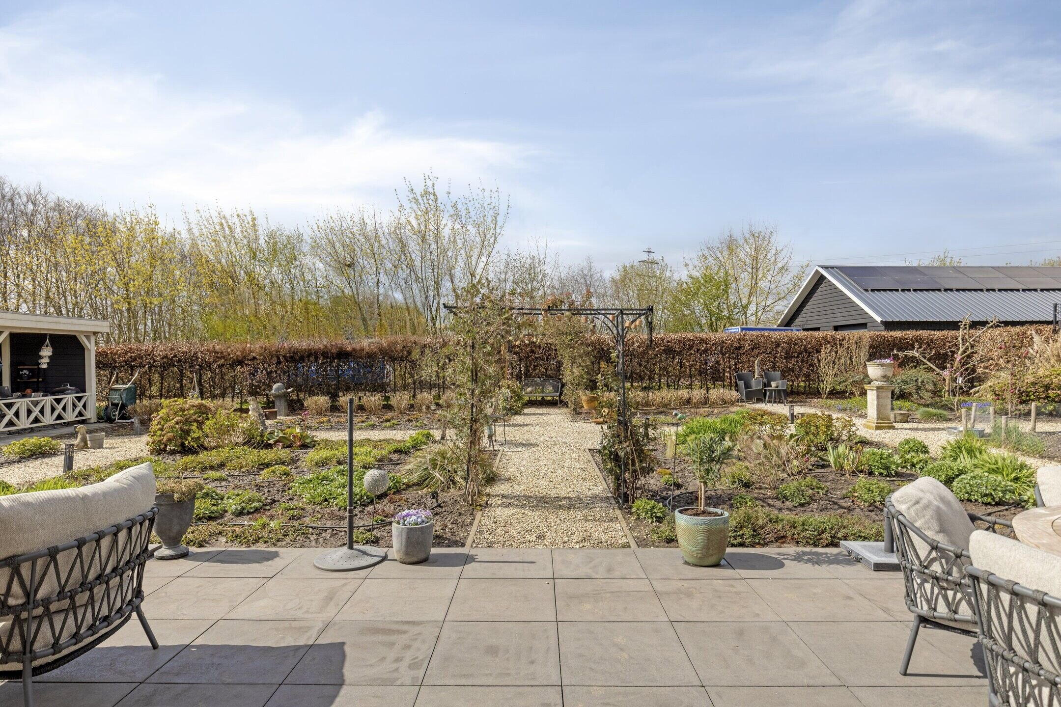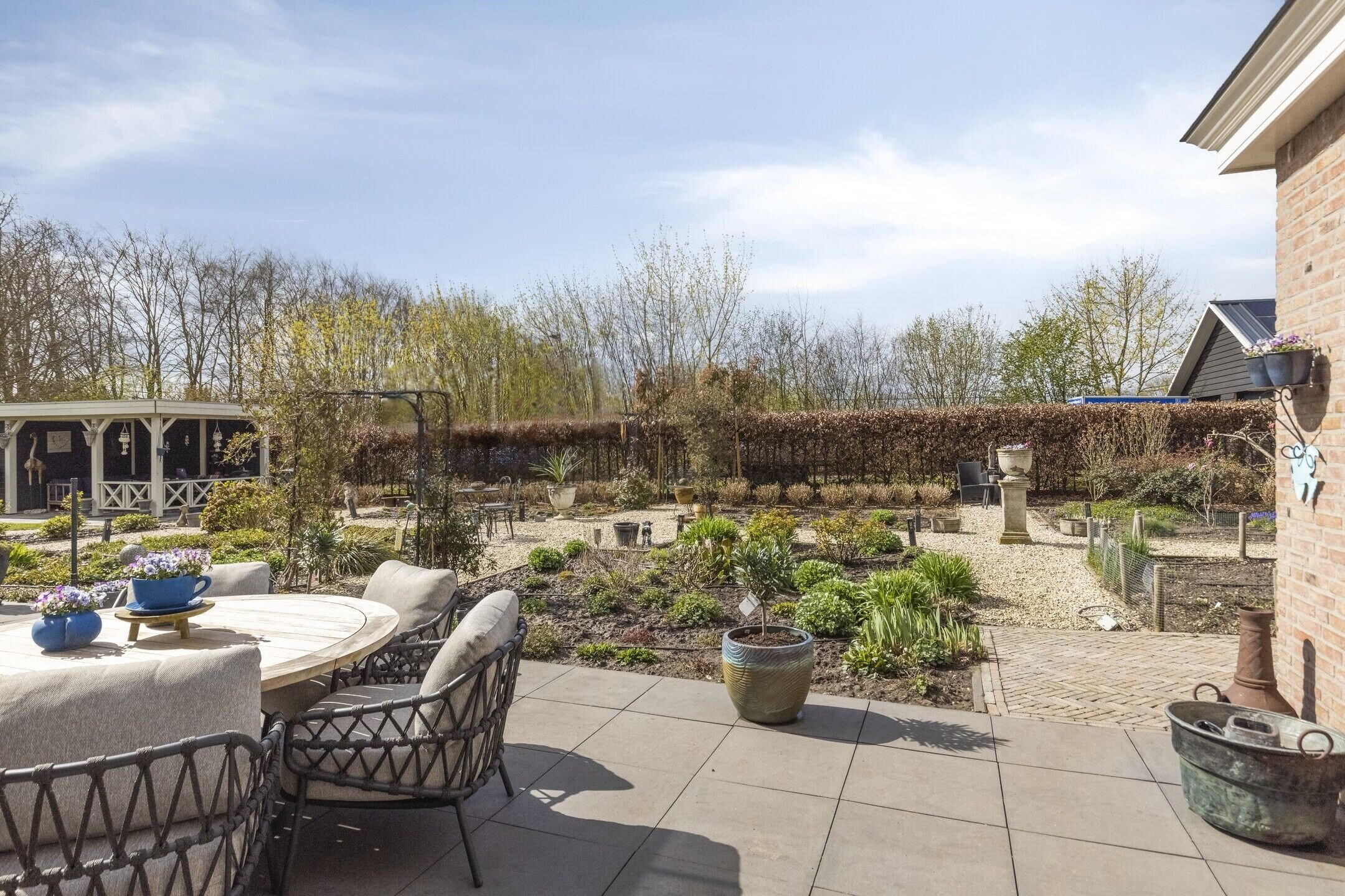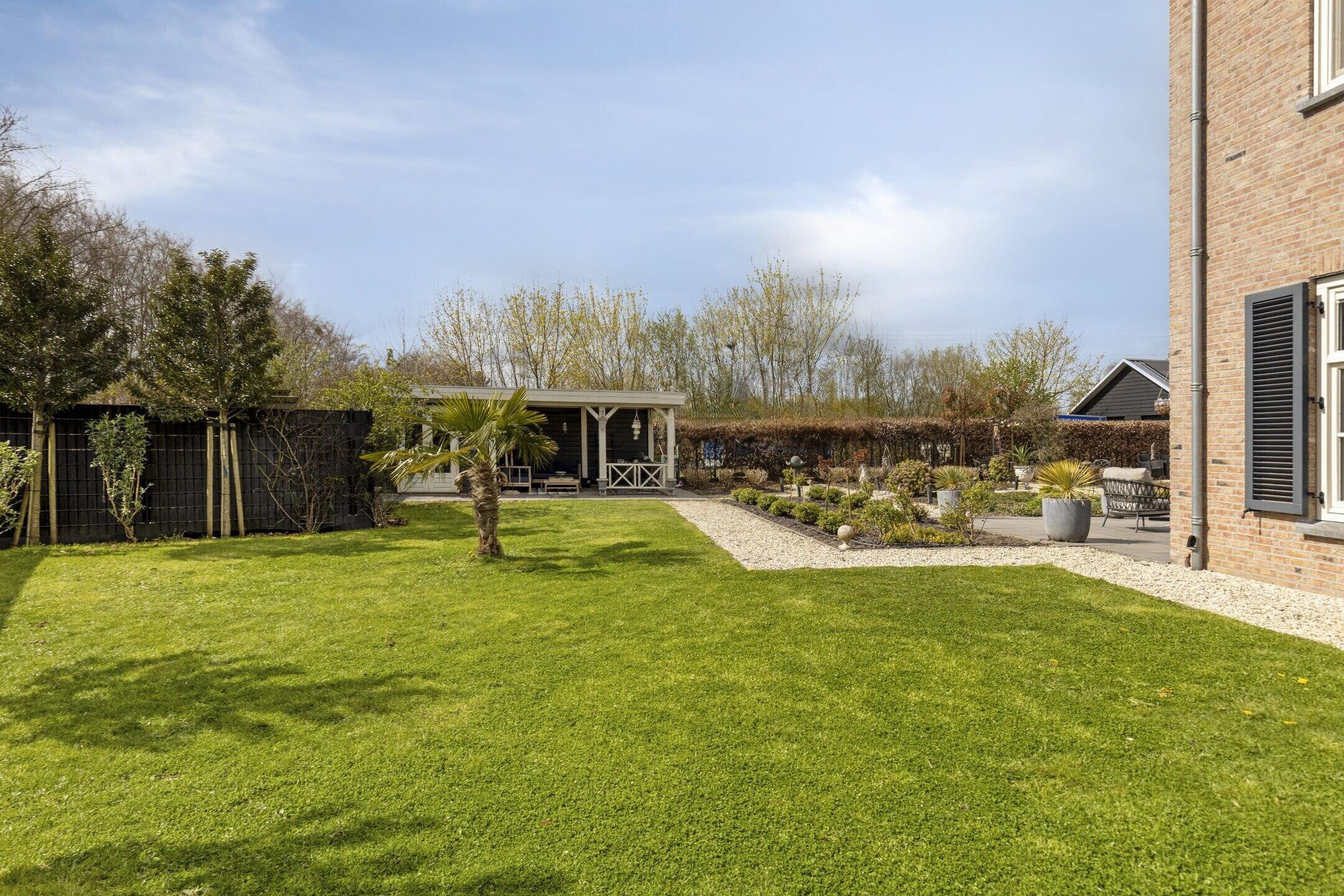 De fraai aangelegde tuin rondom de woning biedt een perfecte balans tussen luxe en ontspanning. Aan de achterzijde vindt u een ruime tuin met siergrind, beplanting en meerdere terrassen, direct bereikbaar via de schuifpuien vanuit de woning.