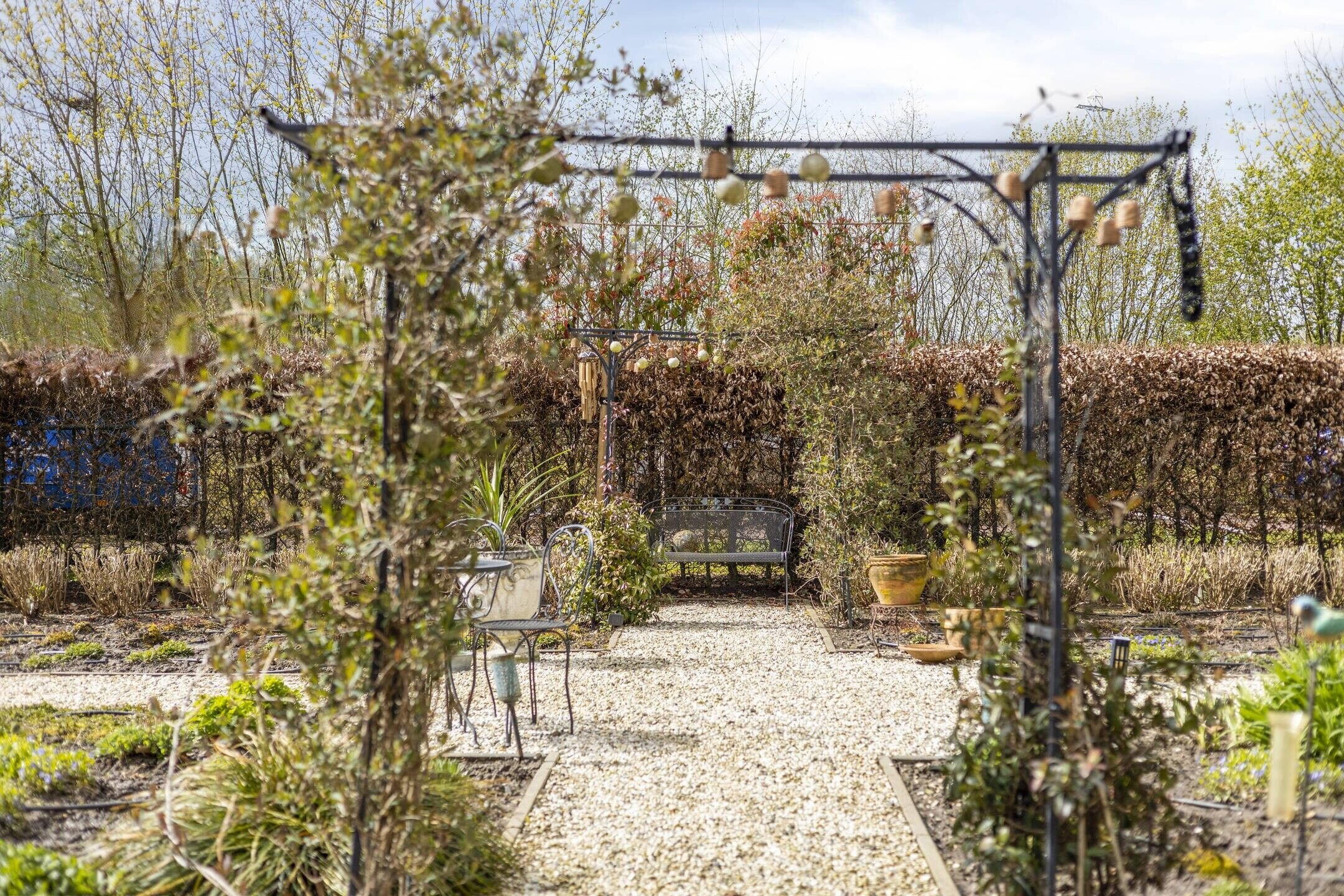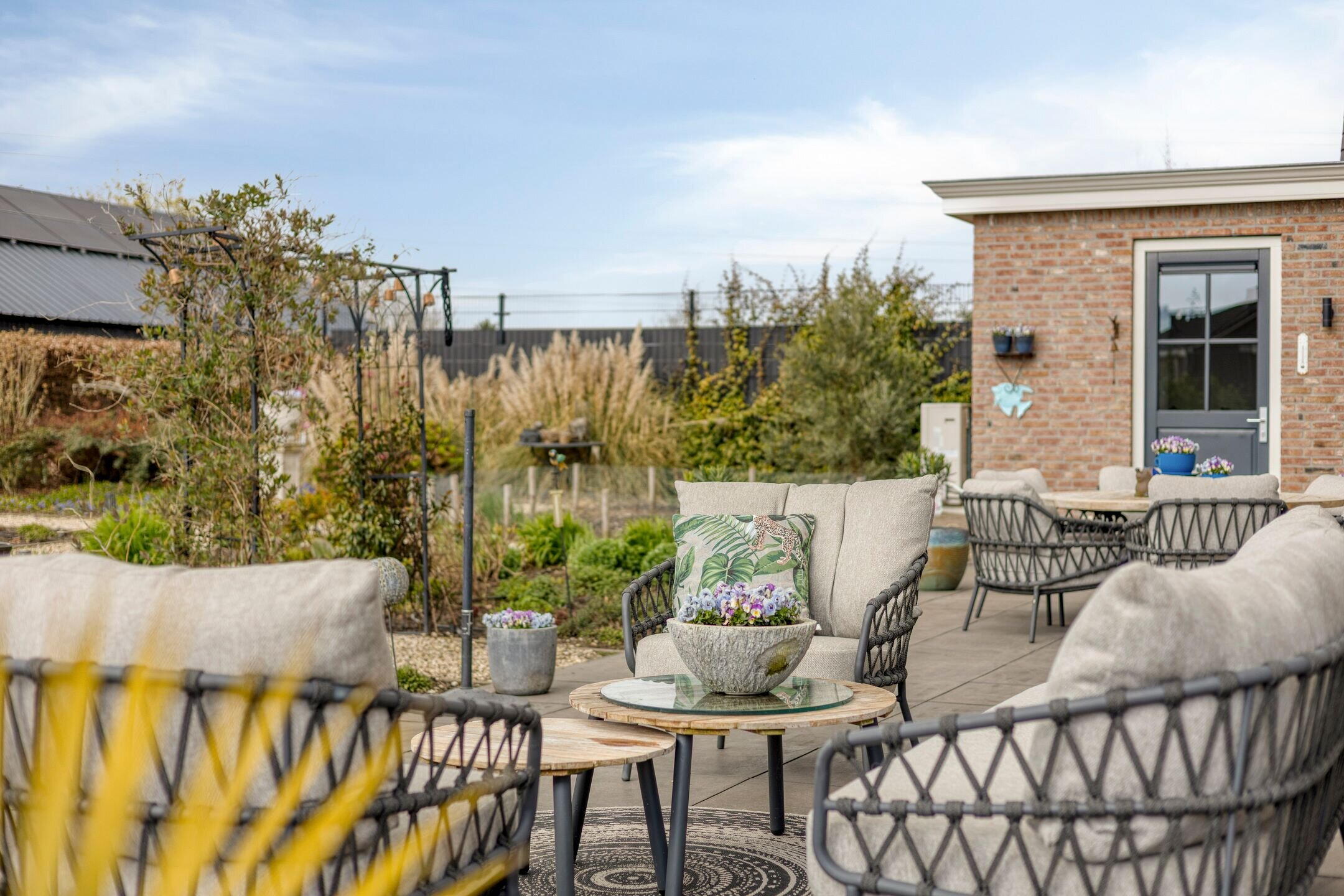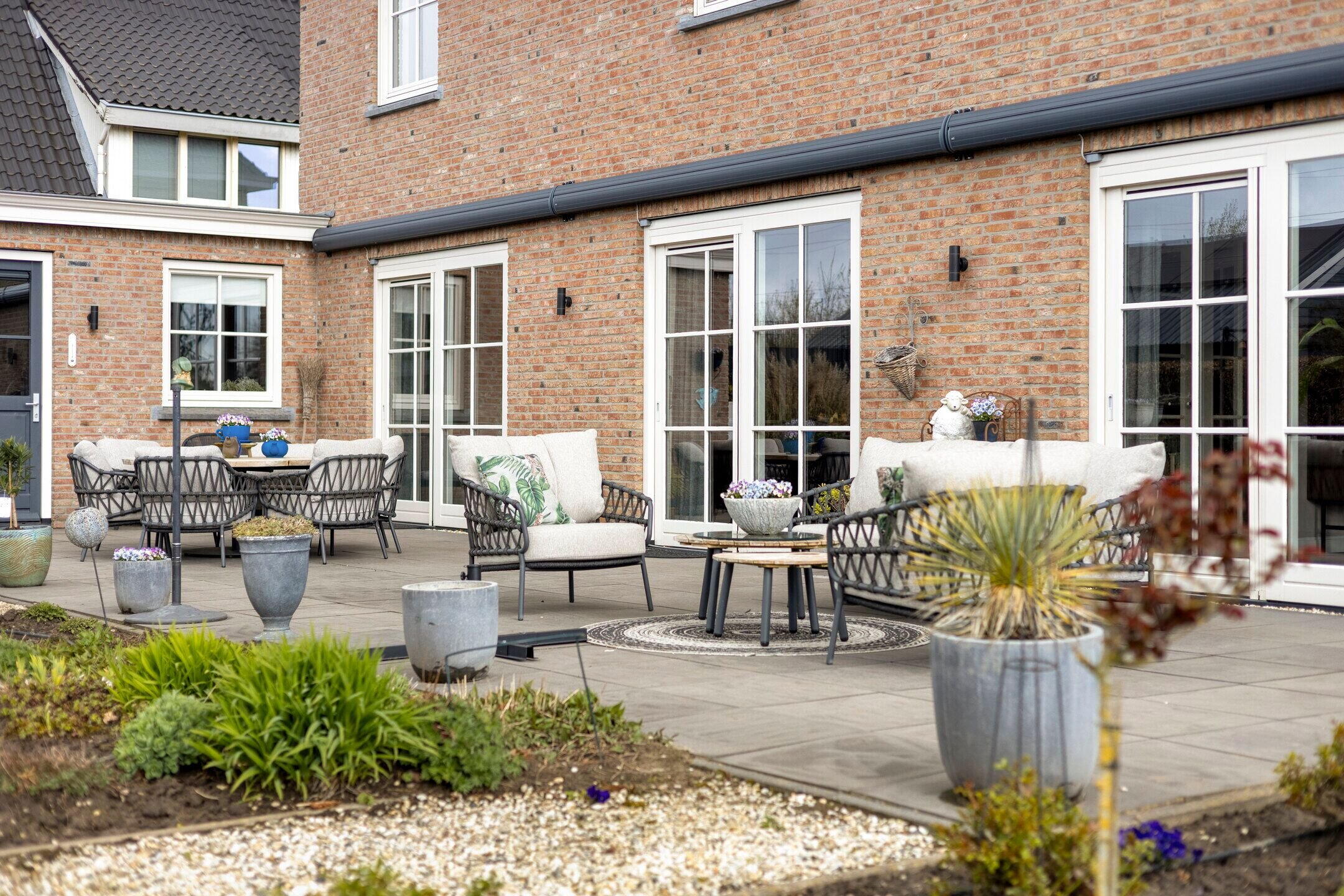 De fraai aangelegde tuin rondom de woning biedt een perfecte balans tussen luxe en ontspanning. Aan de achterzijde vindt u een ruime tuin met siergrind, beplanting en meerdere terrassen, direct bereikbaar via de schuifpuien vanuit de woning.